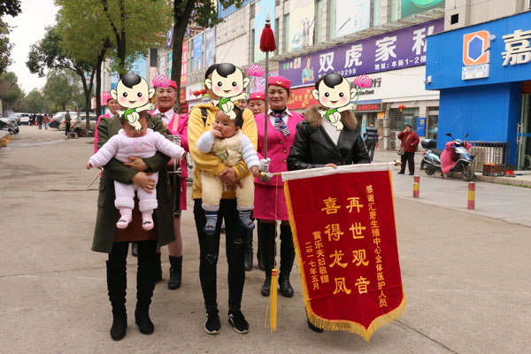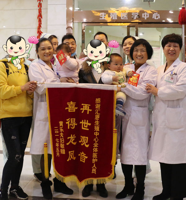 3月1日10时许,邵阳汇恩生殖健康专科医院门前突然传来锣鼓声,黄乐夫妇带着他们9个月大的试管婴儿龙凤宝宝将“再世观音,喜得龙凤”的锦旗送给医院生殖中心主任孟琳,感谢生殖中心工作人员的辛勤付出。