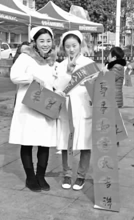 两位护士领到书画家手写的春联后,合影留念。杨敏华摄